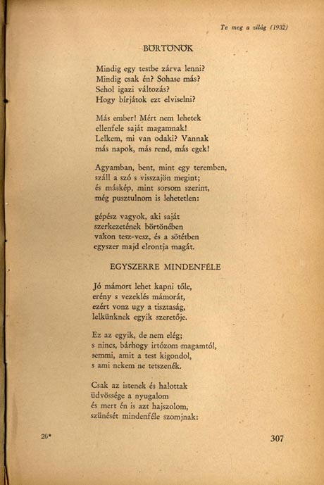 Szabó Lőrinc Összes versei, 1922–1943, Singer és Wolfner Irodalmi Intézet RT. kiadása, Budapest, 1943, 307. p.