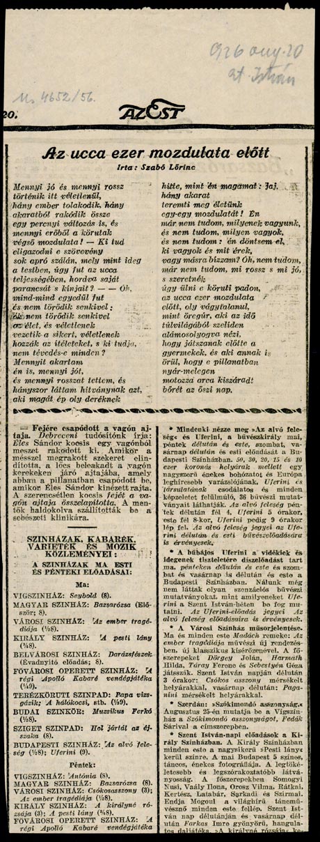 Az Est, 1926. aug. 20. (188. sz.) 9. p. Az ucca ezer mozdulata előtt címmel. Szövege megegyezik az 1926-os Pandora-kiadásban közölttel.