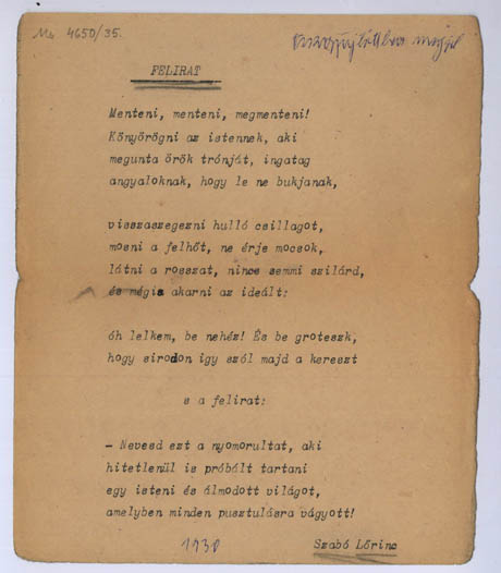 Szabó Lőrinc kurzív betűtípusú Yost írógépén írva, a jobb felső sarokban Szabó