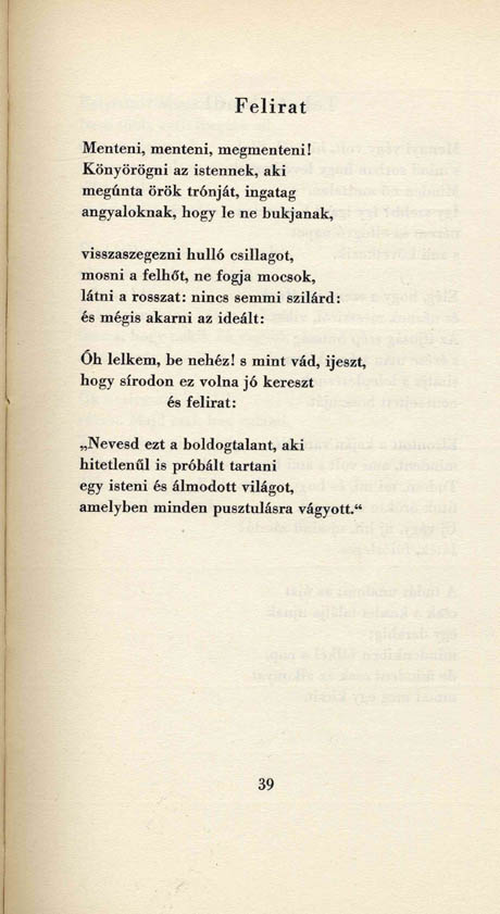 Szabó Lőrinc: Te meg a világ, Versek, Pantheon-kiadás, Budapest, 1932, 39. p. Szövege megegyezik az Összes versei 1943-as kiadásában közölttel.