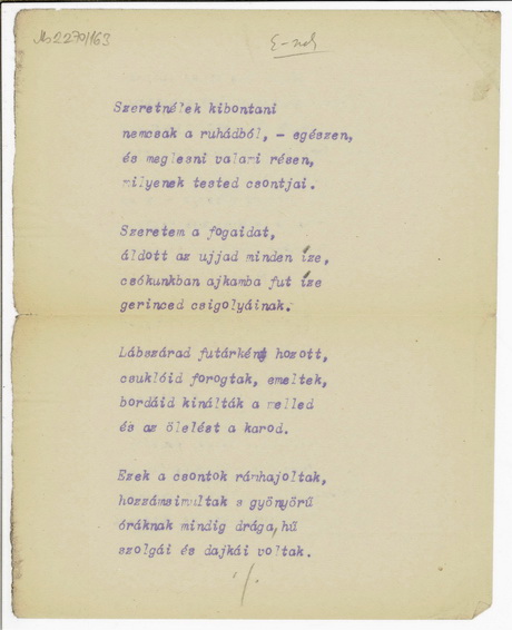 Szabó Lőrinc kurzív betűtípusú Yost írógépén írt másodpéldány; számozott