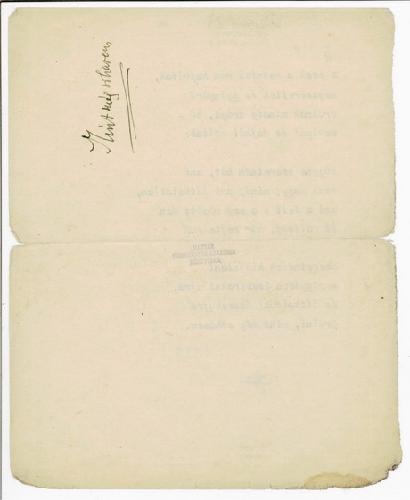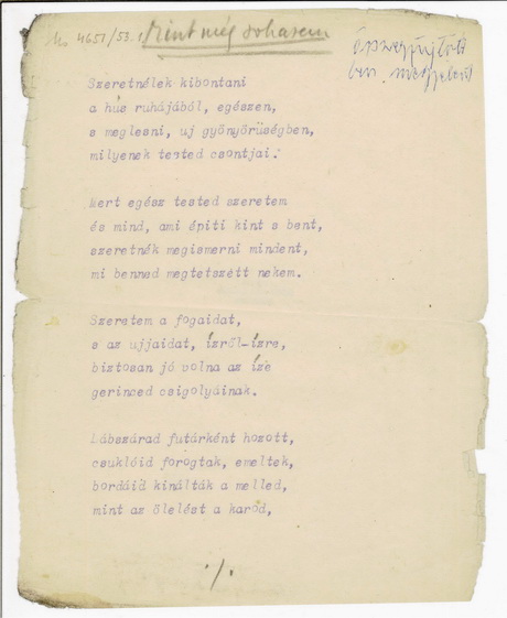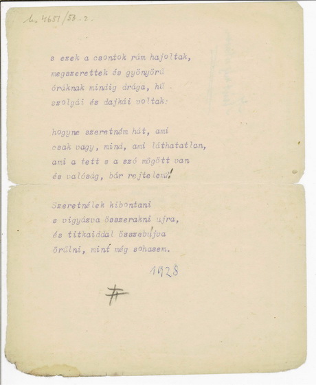 Szabó Lőrinc kurzív betűtípusú Yost írógépén készült; 1. f. r. tetején autográf