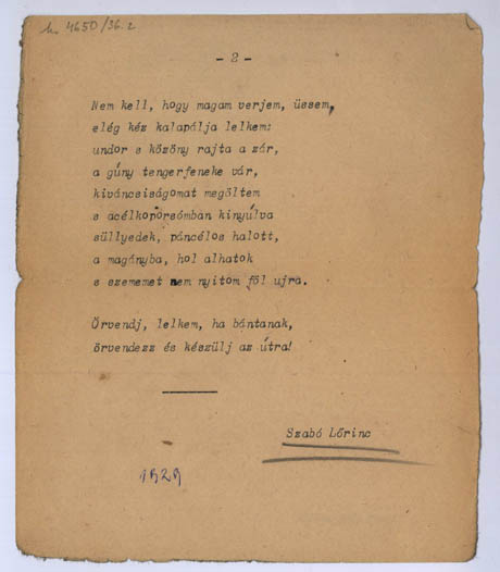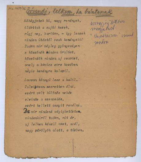lelkem, ha bántanak”; a lap jobb szélén Szabó Lőrincné megjegyzése. Szövege