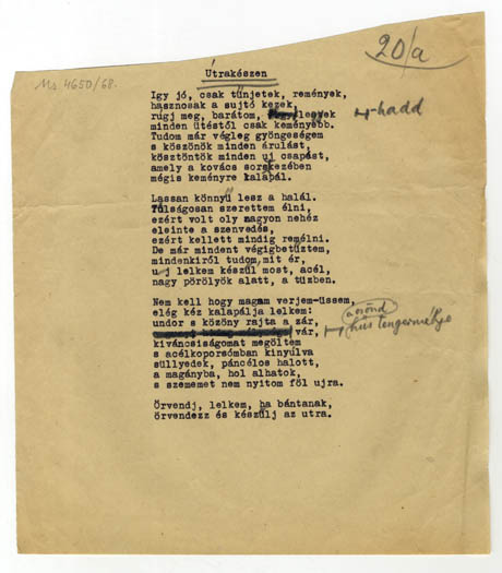 Gépirat autográf javításokkal, a jobb felső sarokban a számozás: 20/a;