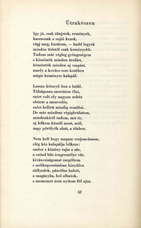 Szabó Lőrinc: Te meg a világ, Versek, Pantheon-kiadás, Budapest, 1932, 42–43. p. Útrakészen címmel. Szövege megegyezik az Összes versei 1943-as kiadásában közölttel.